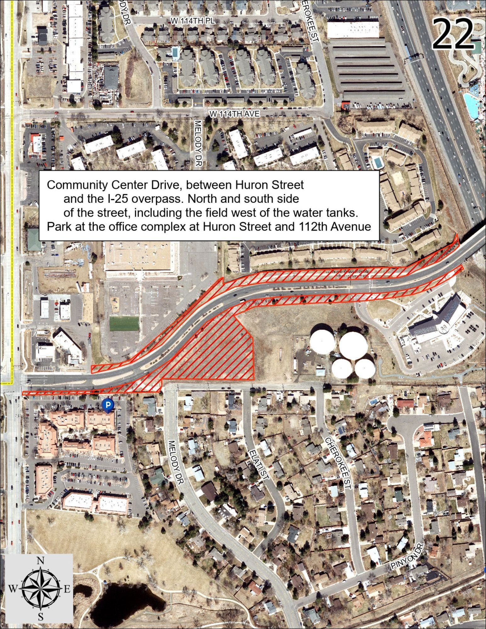 Community Center Drive, between Huron Street and the I-25 overpass. North and South sides of the street, including the fields west of the water tanks.